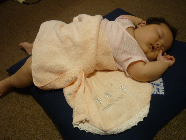 今ではお座布団からはみ出して、今日は寝返りしそうな場面を見てしまいました